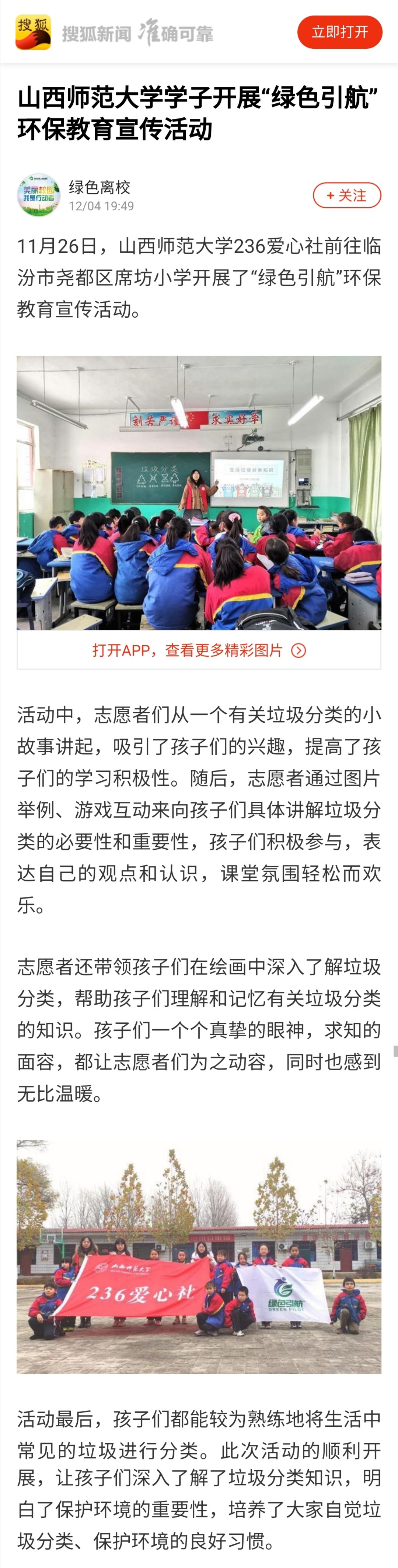 12月4日,搜狐新闻客户端以“yl6809永利学子开展‘绿色引航’环保教育宣传活动”为题报道了公司236爱心社“绿色引航”环保教育宣传活动。