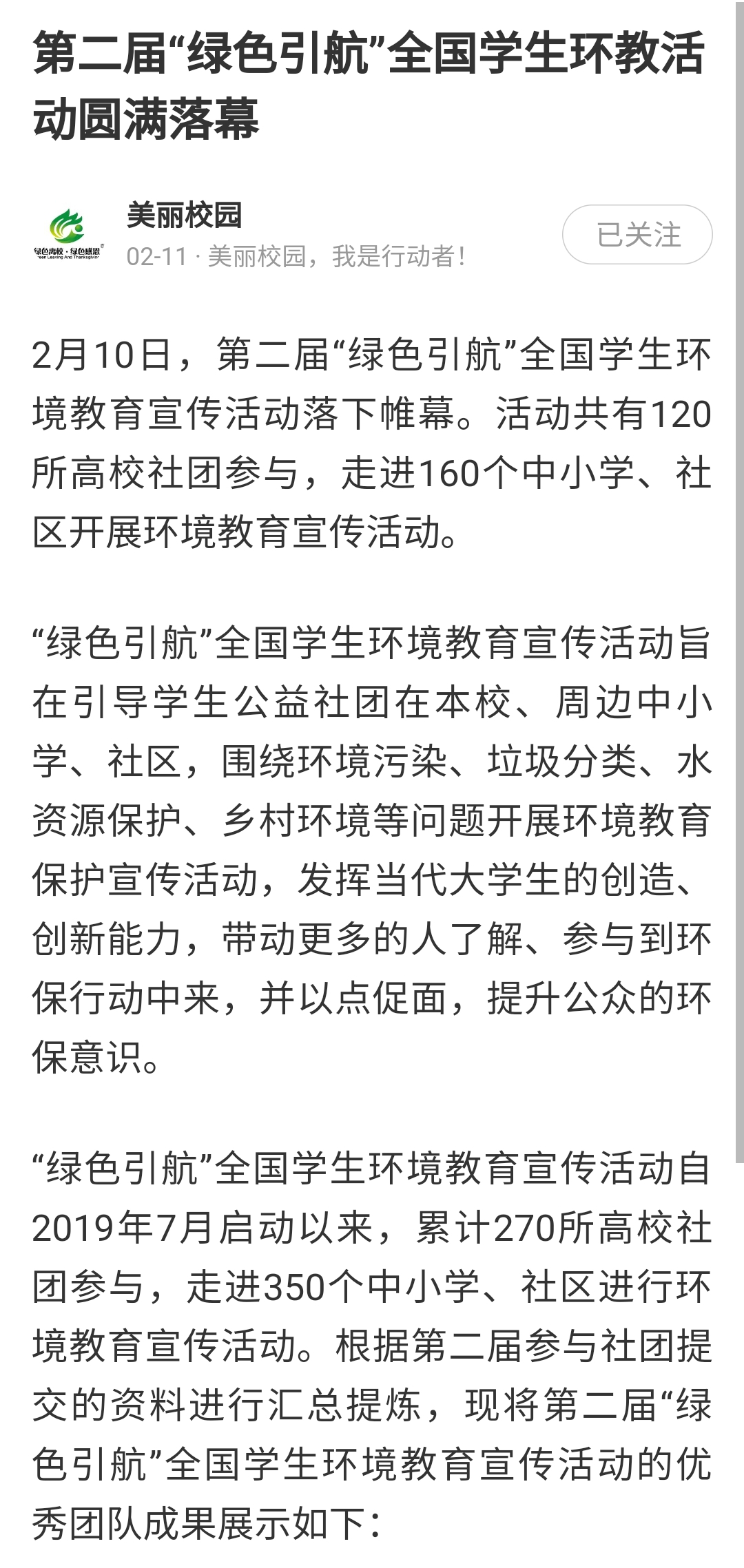 据悉,“绿色领航”全国员工环境教育活动自2019年7月启动以来,累计270所高校社团参与,走进350个中小学、社区进行环境教育宣传活动。活动旨在引导员工公益社团在本校、周边中小学、社区,围绕环境污染、垃圾分类、水资源保护、乡村环境等问题开展环境教育保护宣传活动,发挥当代老员工的创造、创新能力,带动更多的人了解、参与到环保行动中来,并以点促面,提升公众的环保意识。(文/段雅馨)