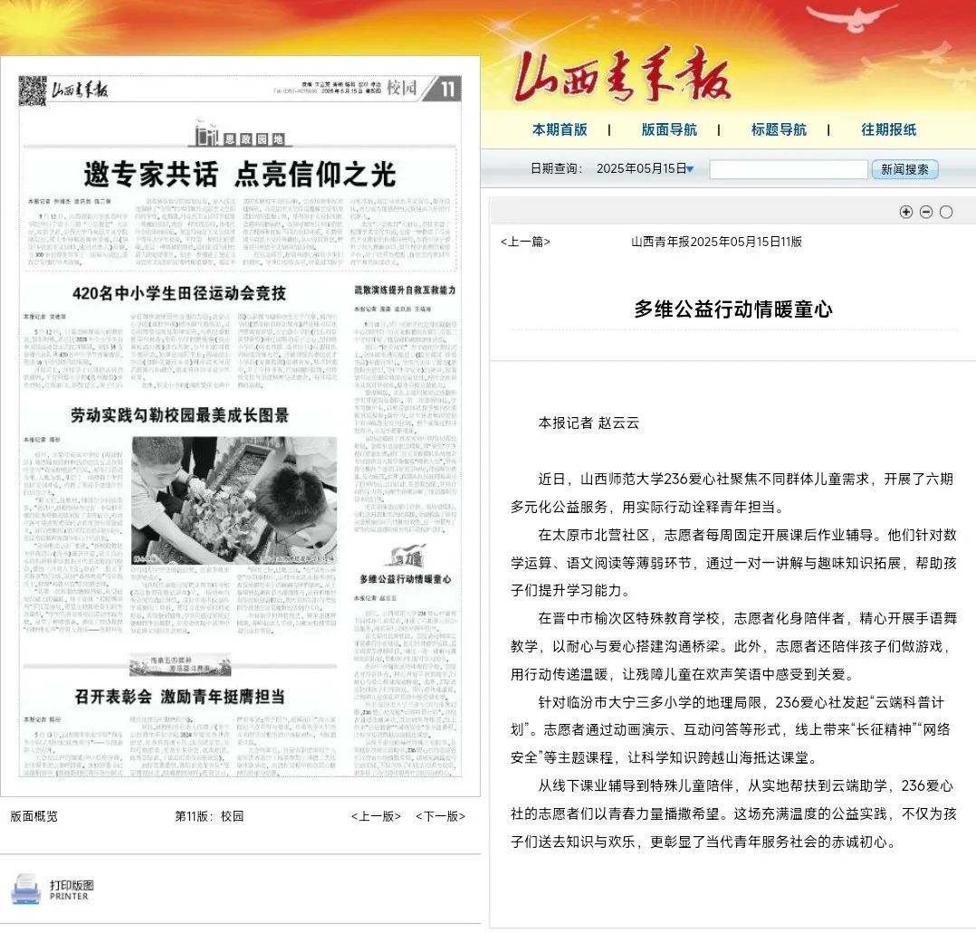 《山西青年报》在报道中指出,从线下课业辅导到特殊儿童陪伴,从实地帮扶到云端助学,236爱心社的志愿者们以青春力量播撒希望。这场充满温度的公益实践,不仅为孩子们送去知识与欢乐,更彰显了当代青年服务社会的赤诚初心。