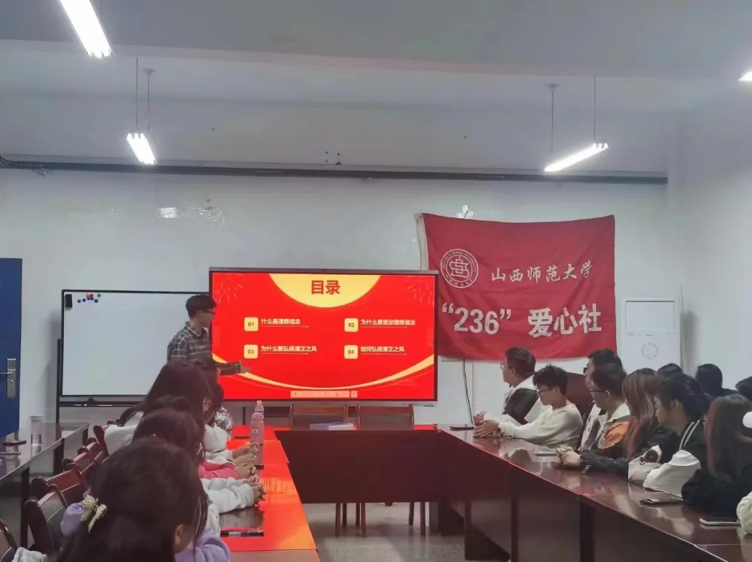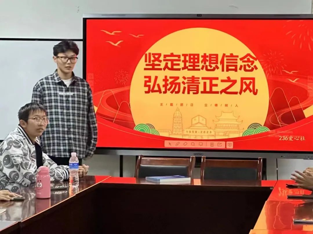 为引导同学们树立正确的价值观和道德观念。10月11日晚八点,236爱心社在南区实验楼s202举办了“坚定理想信念,弘扬清正之风”主题团日活动,活动由236爱心社成员何毅主持。