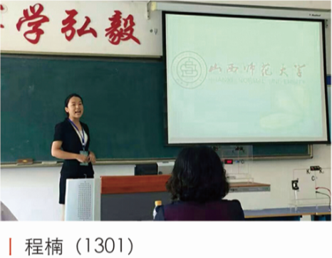 2013级公费师范生程楠,共获得6项省级以上奖项,其中国家级奖项5项(一等奖3项)、省级奖项5项;2014级公费师范生李倩,共获得11项省级以.上奖项,其中国家级奖项6项(一等奖3项)、省级奖项5项,荣获山西师大学2018年“科技创新”和谐青春章;2014级公费师范生王强,共获得8项省级以上奖项,其中国家级奖项4项(一等奖2项)、省级奖项4项。被誉为“最美未来人民教师”。