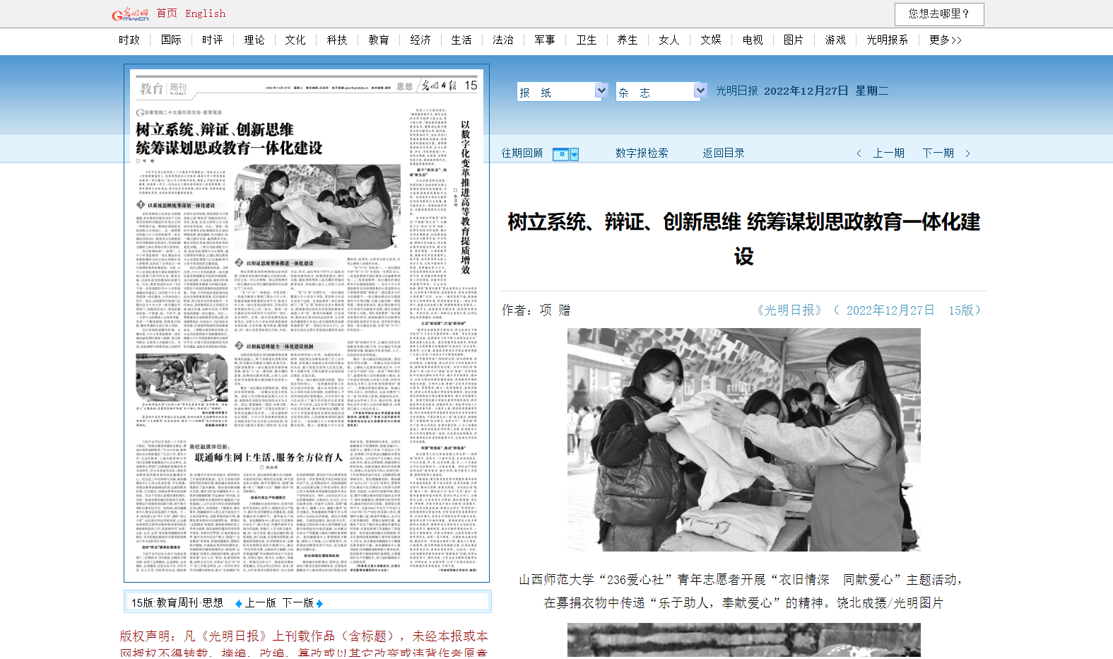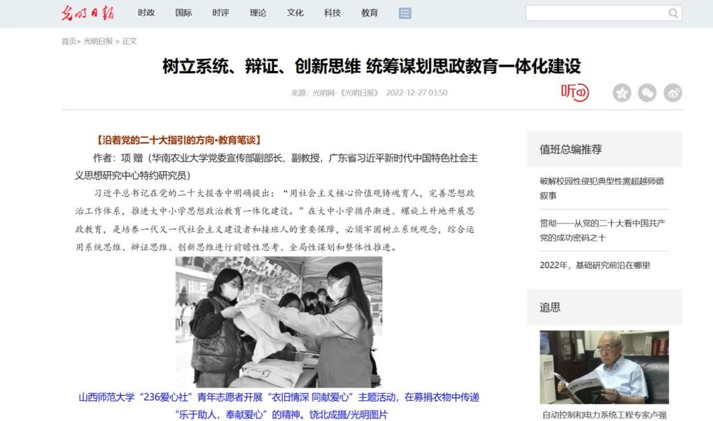 12月27日,光明日报在《树立系统、辩证、创新思维 统筹谋划思政教育一体化建设》一文中,引用了公司236爱心社青年志愿者开展“衣旧情深 同献爱心”主题活动的现场照片。
