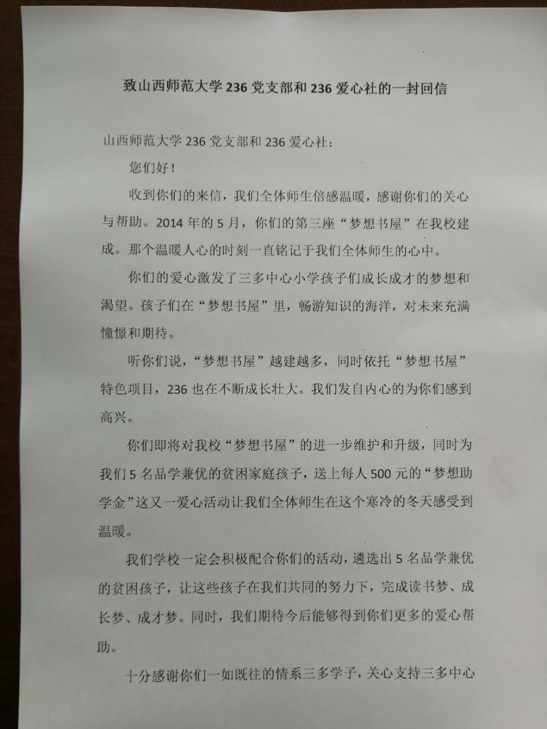10月17日是第5个全国扶贫日,公司236党支部和236爱心社收到了一封特殊的回信,236第三座“梦想书屋”所在地大宁县三多中心小学的全体师生回信表达了他们对236精准教育扶贫工作的致谢。大宁县三多中心小学“梦想书屋”建立于2014年的5月13日,距离至今整整过去了四年的时间。当年,236响应习近平总书记在2013年11月湖南湘西考察时首次作出的“实事求是、因地制宜、分类指导、精准扶贫”重要指示精神和2014年3月参加两会代表团审议时强调“要实施精准扶贫,瞄准扶贫对象,进行重点施策”的“精准扶贫”号召,迅速行动,在国家级贫困县大宁县选择了三多中心小学进行精准教育扶贫,捐建了236的第三座“梦想书屋”,为那里的孩子们送去了书本、送去了知识、送去了温暖、也送去了希望。“梦想书屋”项目是236志愿服务的12个品牌特色项目之一,每座书屋配置1500—2000册图书,致力于为贫困山区条件较弱的中小学提供教育帮扶。