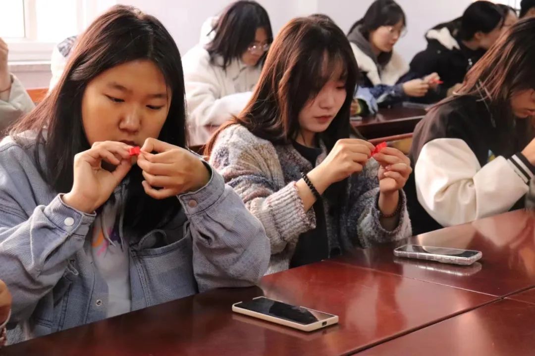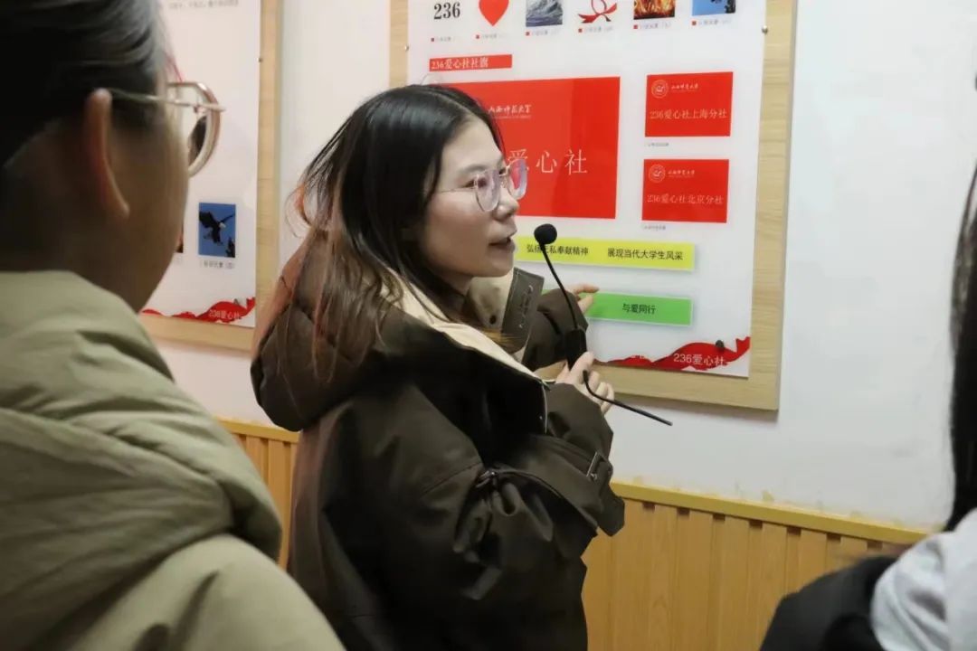 课程伊始,郭桂春首先带领同学们观看了236专题片,让大家对236有了初步了解。随后在郭桂春的带领下,沿着236“爱的足迹”,集中参观了“236”文化教育长廊,深入感受“236支部文化、236思政文化、236社团文化、236学业文化、236阵地文化”五大文化为主要内容的236文化,了解“坚守信仰、关注公益、传播爱心、倾情奉献、矢志成才”的236精神。同学们还学习了百人手语“一起向未来”,一起做了红绸带关爱艾滋病人的标识,近距离体验了志愿服务活动,增强了大家传递爱心、关注公益的意识。