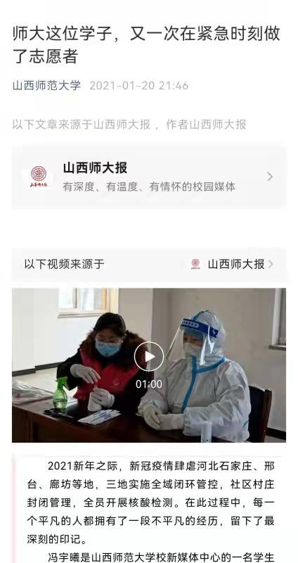 2019级员工冯宇曦(1903班)连续两次参与抗疫志愿服务,受到《人民日报》客户端和公司校园网专题报道,并荣获河北省辛集市“最美巾帼志愿者”荣誉称号。被誉为"最美逆行者"。